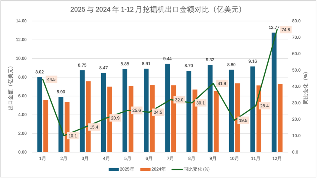 ၂၀၂၅ ခုနှစ်တွင် တရုတ်နိုင်ငံ၊excavatorပို့ကုန်ဈေးကွက်သည် "တစ်နှစ်ပတ်လုံး တသမတ်တည်း တိုးတက်မှုနှင့် ဒီဇင်ဘာလတွင် နောက်ဆုံး အပြေးအလွှား" ၏ ထူးခြားသော အင်္ဂါရပ်တစ်ရပ်ကို ပြသခဲ့ပြီး ပို့ကုန်ပမာဏနှင့် တန်ဖိုးမှာ တစ်နှစ်ထက်တစ်နှစ် သိသိသာသာ တိုးမြင့်လာကာ ပြည်ပဈေးကွက်တွင် ပြိုင်ဆိုင်မှုပြင်းထန်မှုကို ပြသခဲ့သည်။