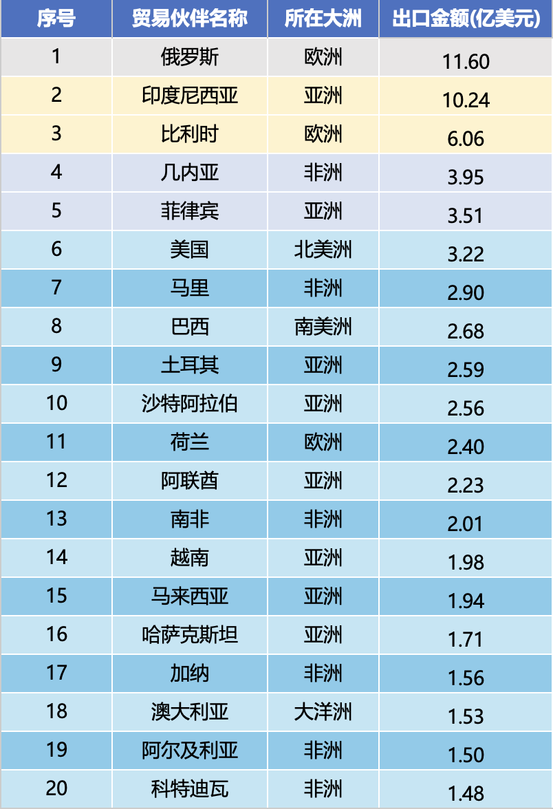 2025 ခုနှစ် ဇန်နဝါရီလမှ ဒီဇင်ဘာလအထိ ပို့ကုန်ပမာဏအဆင့်သတ်မှတ်ချက်အရ ထိပ်တန်းကုန်သွယ်ဖက်ဆယ်နိုင်ငံမှာ ရုရှား (ဒေါ်လာ ၁.၁၆ ဘီလီယံ)၊ အင်ဒိုနီးရှား (ဒေါ်လာ ၁.၀၂၄ ဘီလီယံ)၊ ဘယ်လ်ဂျီယံ (ဒေါ်လာ ၆၀၆ သန်း)၊ ဂီနီ (ဒေါ်လာ ၃၉၅ သန်း)၊ ဖိလစ်ပိုင် (ဒေါ်လာ ၃၅၁ သန်း)၊ အမေရိကန် (ဒေါ်လာ ၃၂၂ သန်း)၊ မာလီ (ဒေါ်လာ ၂၉၀ သန်း)၊ ဘရာဇီး (ဒေါ်လာ ၂၆၈ သန်း)၊ (ဒေါ်လာ ၂၅၆ သန်း)။ ထိပ်တန်းဈေးကွက်ဆယ်ခု၏ စုစုပေါင်းပို့ကုန်တန်ဖိုးသည် အမေရိကန်ဒေါ်လာ ၄.၉၃ ဘီလီယံအထိ ရောက်ရှိခဲ့ပြီး စုစုပေါင်း ပို့ကုန်တန်ဖိုး၏ ၄၅.၉% ရှိပြီး အဓိကစျေးကွက်တွင် အာရုံစူးစိုက်မှု မြင့်မားသည်။