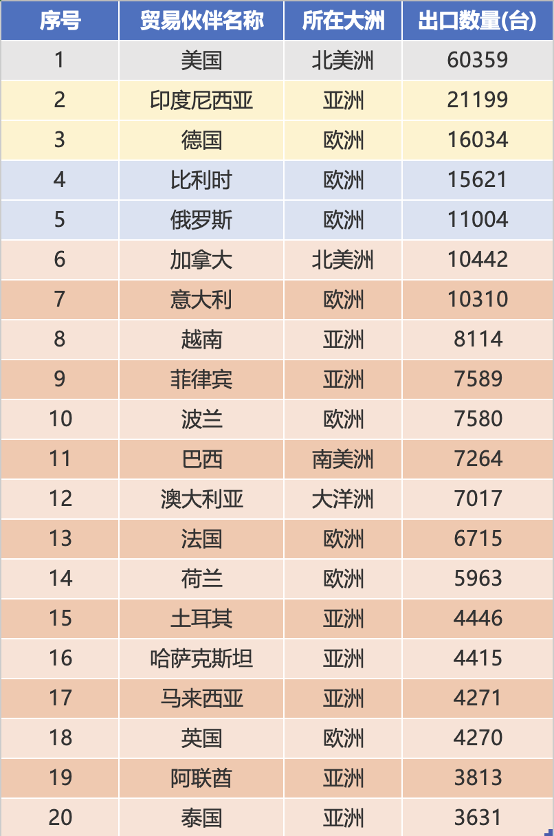 ပမာဏအဆင့်သတ်မှတ်ချက်နှင့် သိသိသာသာ ဆန့်ကျင်ဘက်ဖြစ်ပြီး၊ အမေရိကန်သည် ပို့ကုန်ပမာဏ 60000 ကျော်၊ ဒုတိယအဆင့် အင်ဒိုနီးရှားထက် 2.8 ဆ၊ တစ်ယူနစ်လျှင် ဒေါ်လာ 5000 သာရှိပြီး ၎င်း၏ စီးပွားရေးစျေးကွက်လက္ခဏာများကို မီးမောင်းထိုးပြထားသည်။ ဂျာမနီ၊ ဘယ်လ်ဂျီယံ၊ ရုရှား၊ အီတလီနှင့် ပိုလန်တို့သည် ထိပ်တန်း ၁၀ ခုတွင် ရပ်တည်နေပြီး ဥရောပစျေးကွက်၏ စွမ်းဆောင်ရည်မှာ အံ့အားသင့်ဖွယ်ဖြစ်ပြီး စုစုပေါင်း တင်ပို့မှုပမာဏ 61,000 ယူနစ်ဖြင့် ထိပ်ဆုံးဆယ်ခု၏ စုစုပေါင်းပမာဏ၏ 36.0% ဖြင့် ဥရောပဈေးကွက်ရှိ တရုတ်တူးဖော်ရေးသမားများအတွက် ကြီးမားသော ဝယ်လိုအားကို ရောင်ပြန်ဟပ်နေသည်။ အင်ဒိုနီးရှား၊ ဗီယက်နမ်နှင့် ဖိလစ်ပိုင်တို့သည် အာရှရှိ ၀ယ်လိုအား အတိုင်းအတာကို တည်ငြိမ်စွာ ထိန်းသိမ်းထားပြီး စုစုပေါင်း ပို့ကုန် ပမာဏ ၃၇၀၀၀ ယူနစ်ဖြင့် ပမာဏဘက်တွင် အရေးပါသော အထောက်အပံ့ ဖြစ်လာသည်။